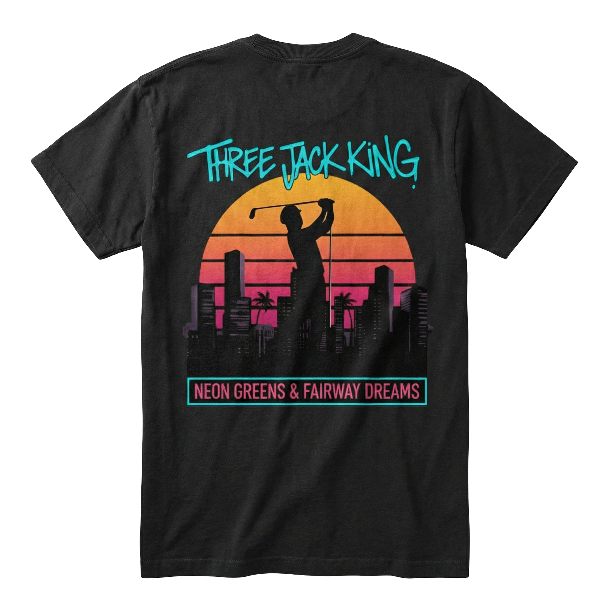 The Fairway Dreams T-Shirt isn't just a shirt—it's a mood. Crafted from 100% heavyweight cotton, this tee offers a rugged, structured feel that stands apart from standard activewear. The thick ribbed neck, the neon card trio on the chest, and the retro cityscape silhouette on the back strike the perfect balance between downtown streetwear and fairway culture, making this a versatile staple whether you're chasing the sunset on the 18th or heading out for the night.