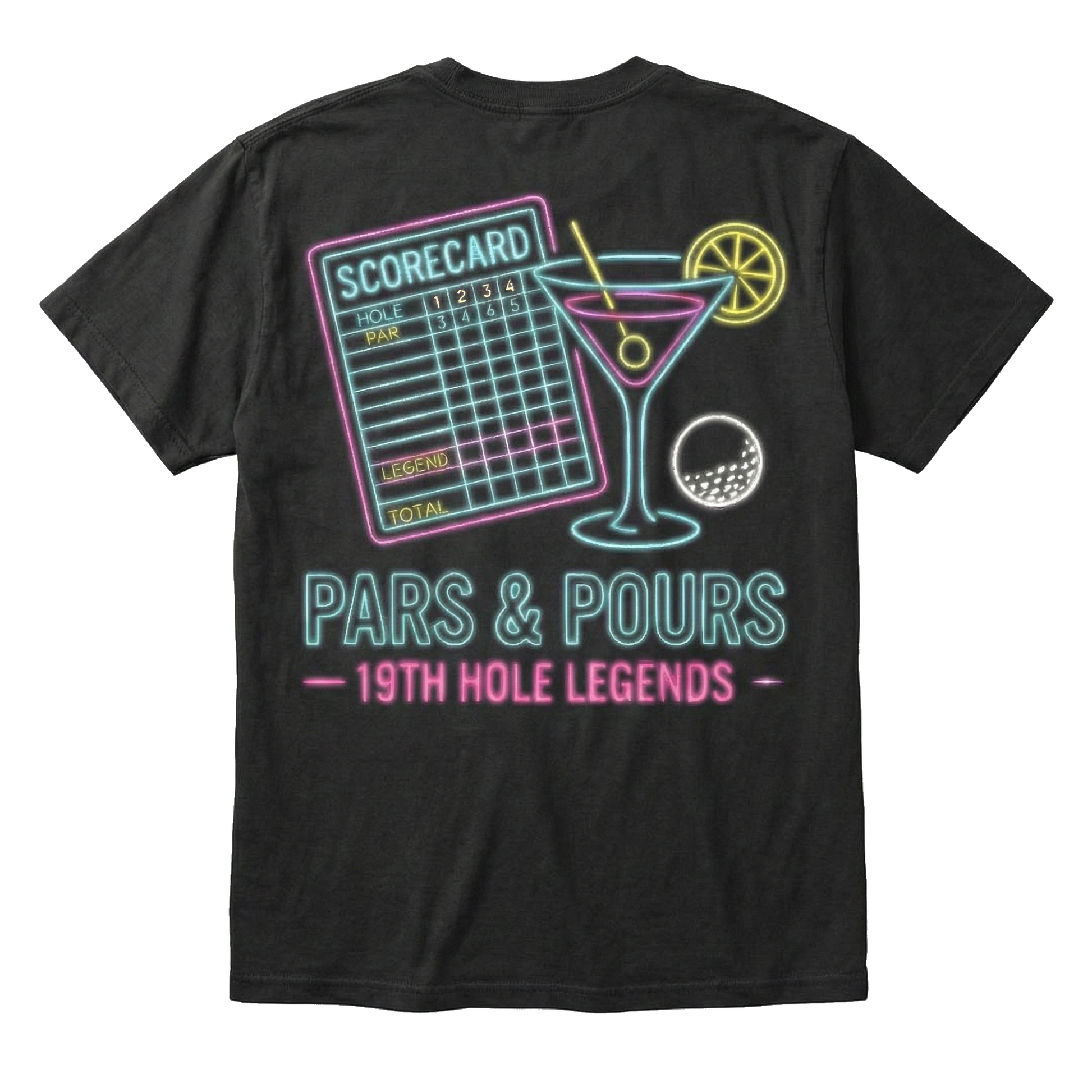 The Neon Pars & Pours shirt isn't just a shirt—it's the official uniform of the 19th hole. Crafted from premium 100% cotton with a heavyweight garment-dyed finish, this tee offers a substantial, vintage-soft feel that only gets better with time. The high-ribbed neck, the signature Three Jack King neon crest on the chest, and the vibrant cocktail-and-scorecard graphic on the back capture the true spirit of "19th Hole Legends." It strikes the perfect balance between street style and clubhouse comfort, making this a heavy-duty staple for celebrating the round—regardless of what the scorecard actually says.